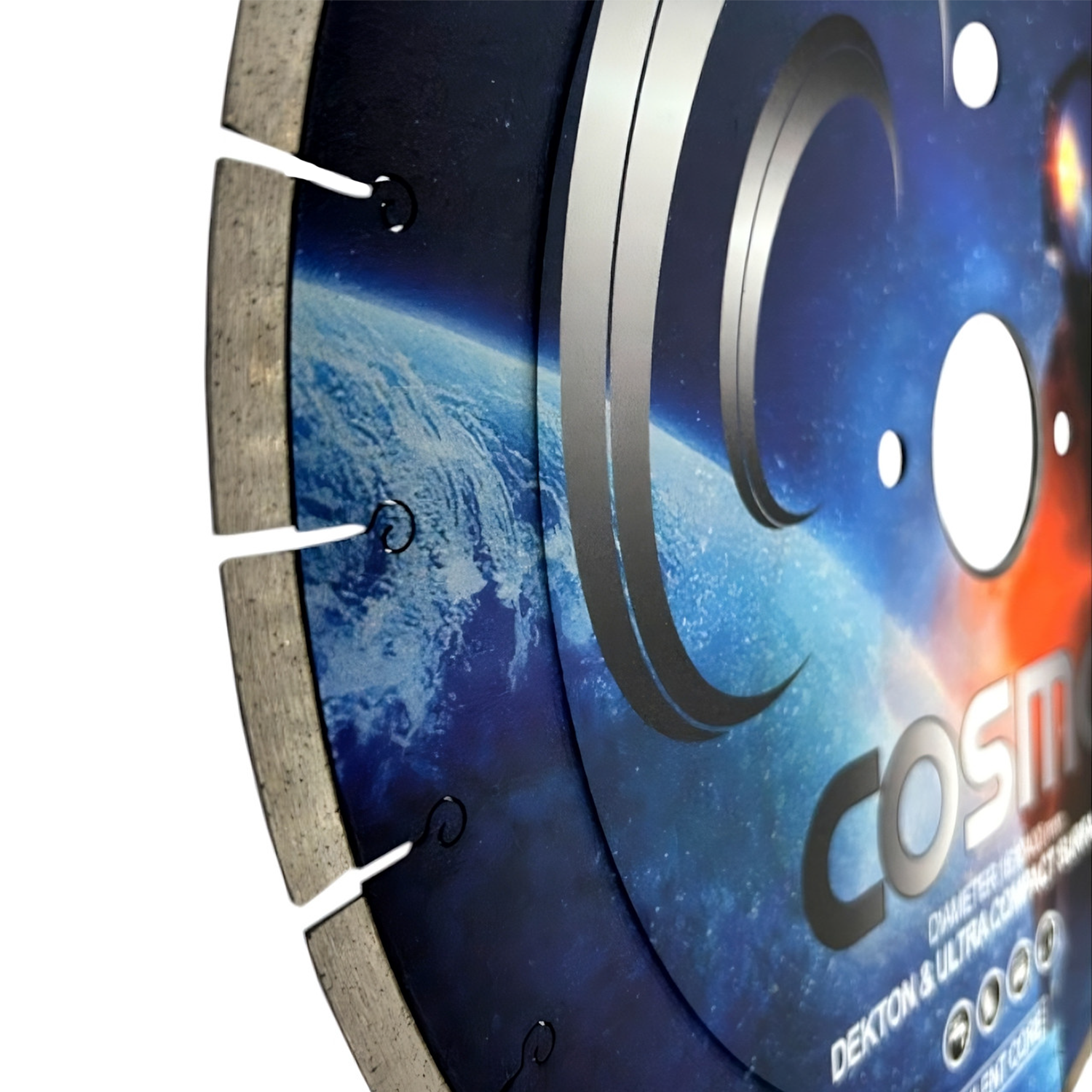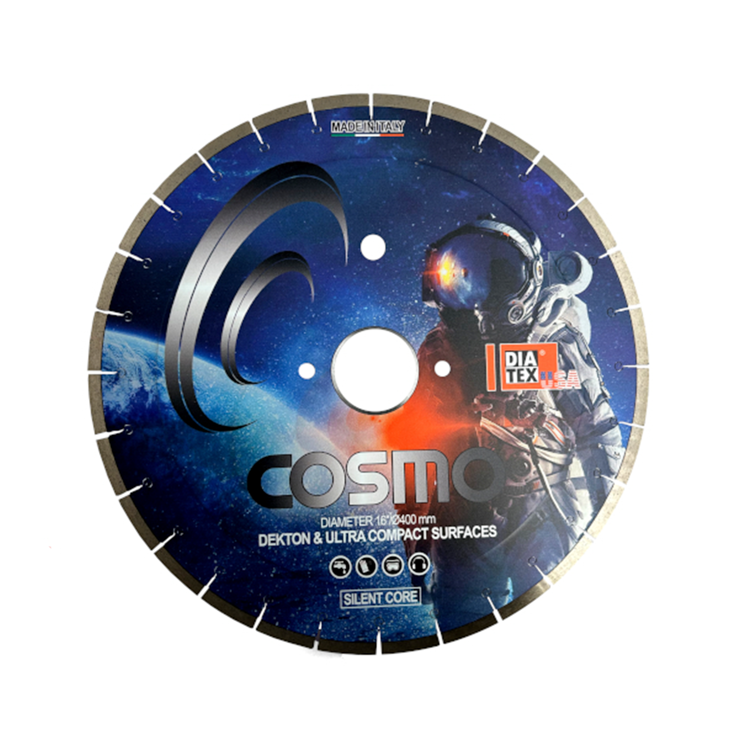 Diatex Cosmo Ceramic Porcelain Bridge Saw Blade. Designed for precision cutting of porcelain and ultra-compact surfaces, the COSMO blade delivers clean, smooth results across all ceramic slab brands. Built with a silent, reinforced core for reduced vibration and noise. COSMO guarantees exceptional results on both straight and miter cuts, making it the perfect solution for professionals working with various ceramic materials. Performs consistently on bridge saws with or without an inverter, no variable speed required. Available in 14” and 16” diameters for professional-grade cutting you can rely on.