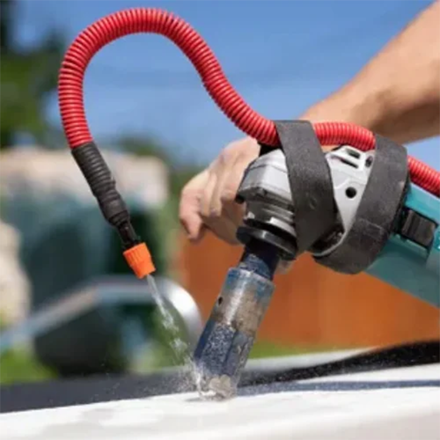 Introducing the Hydro-Tail™ – Universal Controlled Water Attachment. A revolutionary water-distribution attachment that’s changing the game for construction professionals and DIY enthusiasts alike. This innovative tool is your ultimate solution for creating a cleaner, healthier, and more efficient work environment. By seamlessly attaching to any power tool, the Hydro-Tail™ delivers a precise stream of water that effectively suppresses dust, minimizes friction, and extends the life of your valuable diamond blades and bits.