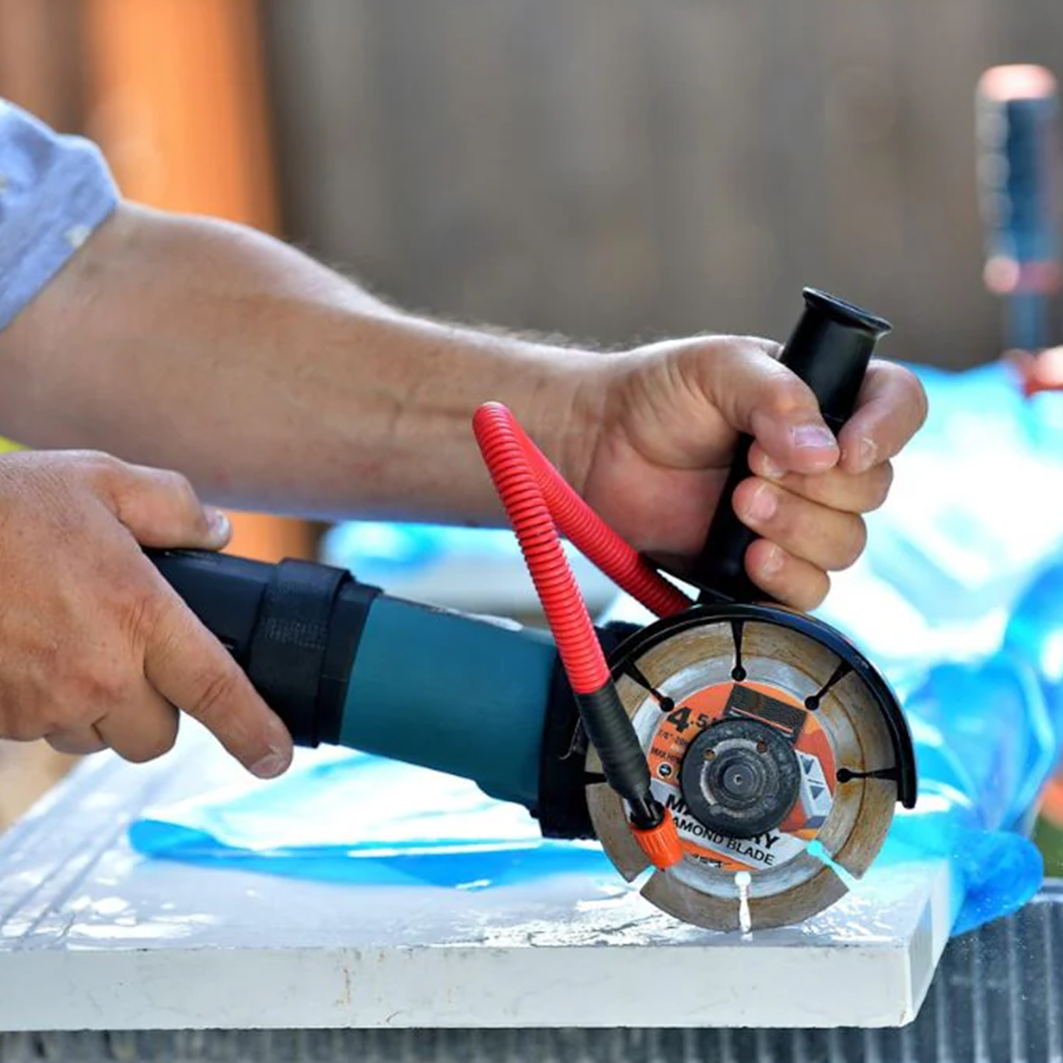 Solution: The Hydro-Tail™ is your all-in-one solution for dust control, tool preservation, and enhanced workplace safety. Its universal design allows it to adapt to any power tool, providing unparalleled dust mitigation capabilities, particularly when working with materials like tile, stone, brick, and block. By effectively controlling dust and fine silica particles, the Hydro-Tail™ dramatically reduces the risk of airborne hazards, creating a healthier and safer environment for you and your team. Moreover, by reducing friction and overheating, it significantly prolongs the life of your diamond blades and bits, saving you money and maximizing your tool investment.