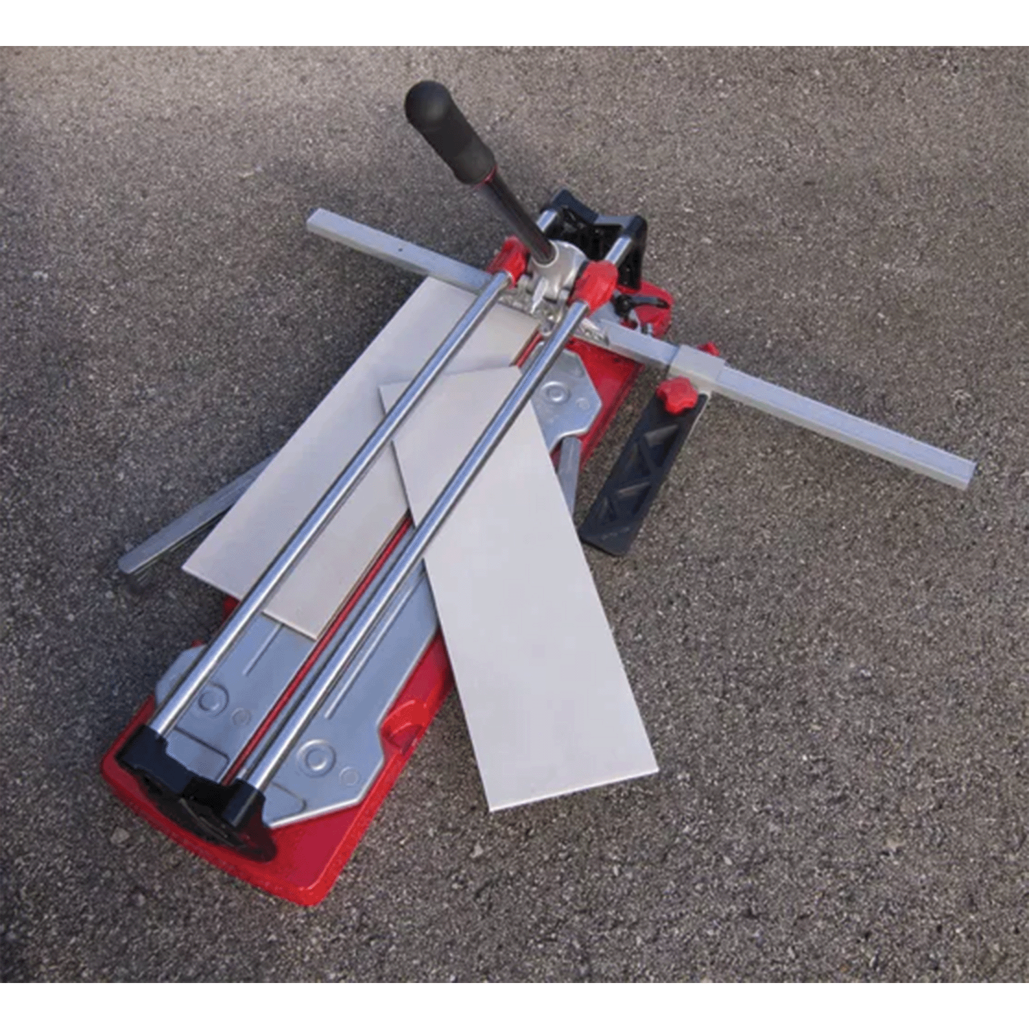 The RUBI TR-MAGNET tile cutters have a high strength two-layer aluminum base with a shock absorption effect, and lateral supports for large tiles.